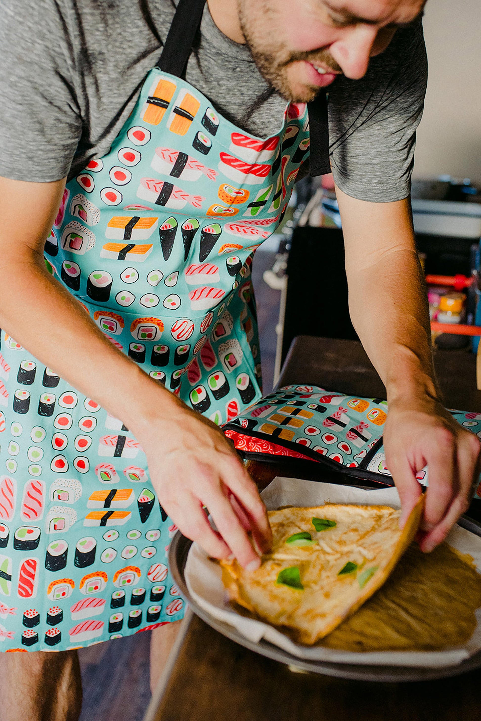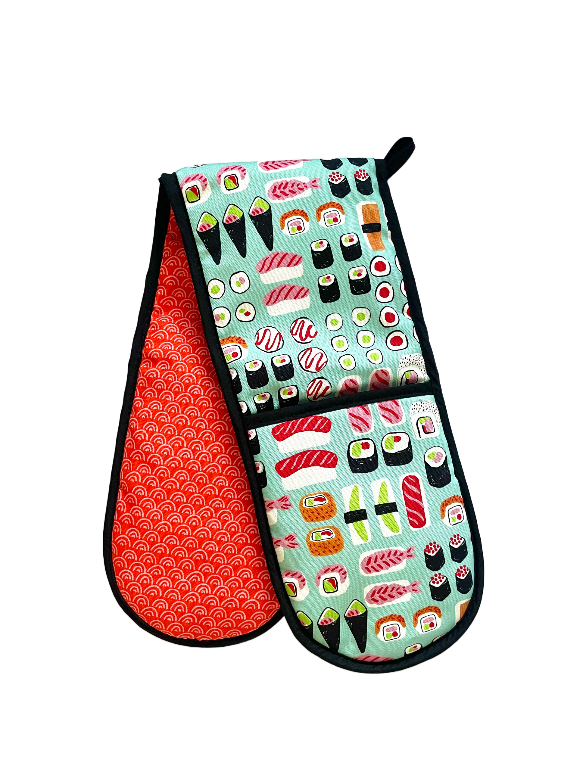Estos divertidos guantes para horno de sushi serían un gran regalo para los amantes de la comida, los amantes de los viajes o cualquier persona que haya estado en Japón. Los guantes tienen un colorido estampado de sushi en la parte delantera y el reverso está estampado con un patrón geométrico en contraste de inspiración japonesa. Tienen un ribete negro y un lazo para colgar y miden 96 cm x 20 cm.