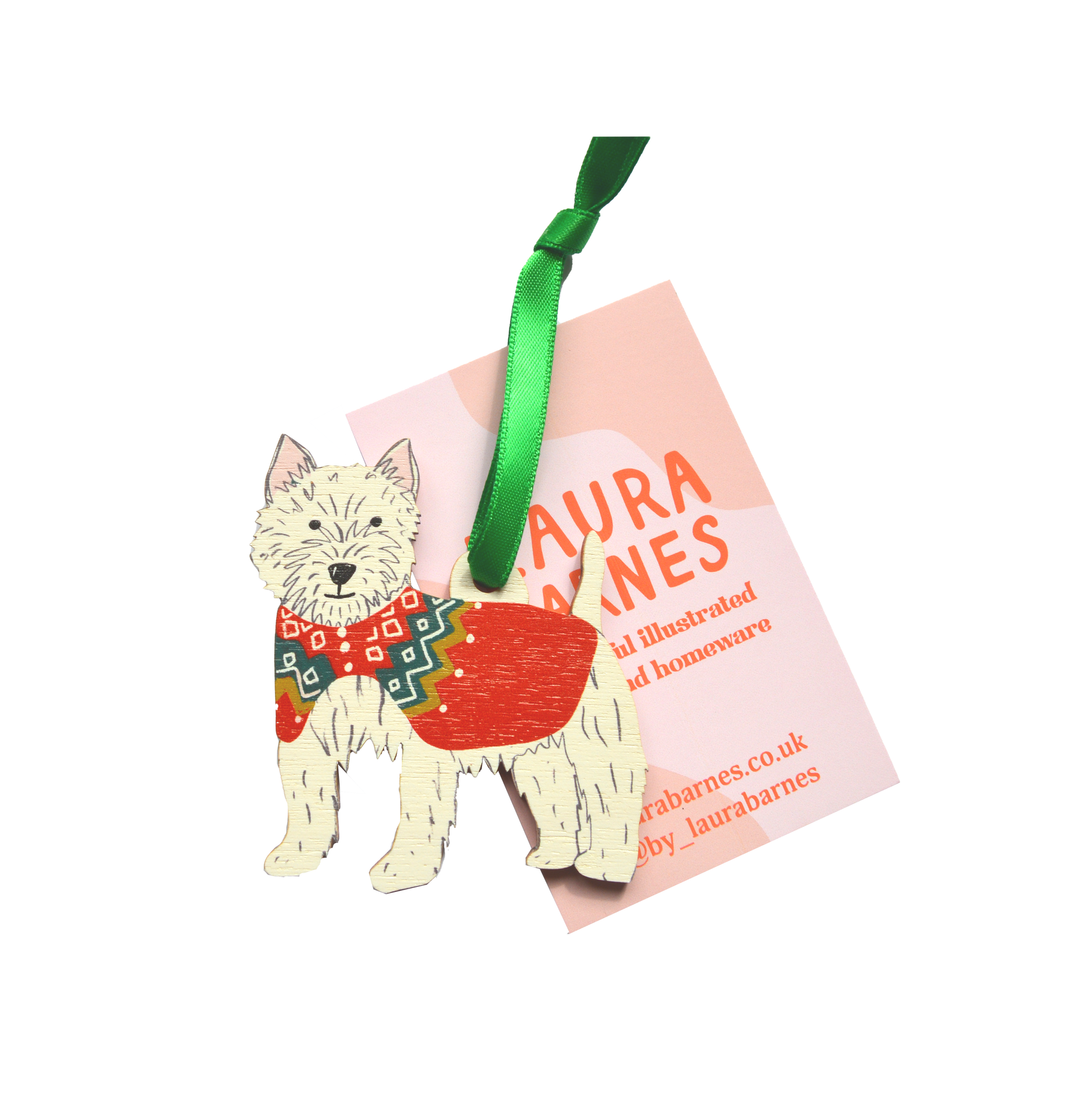 A classic West Highland Terrier design with festive flair, perfect for Westie fans and owners of these snowy little companions.