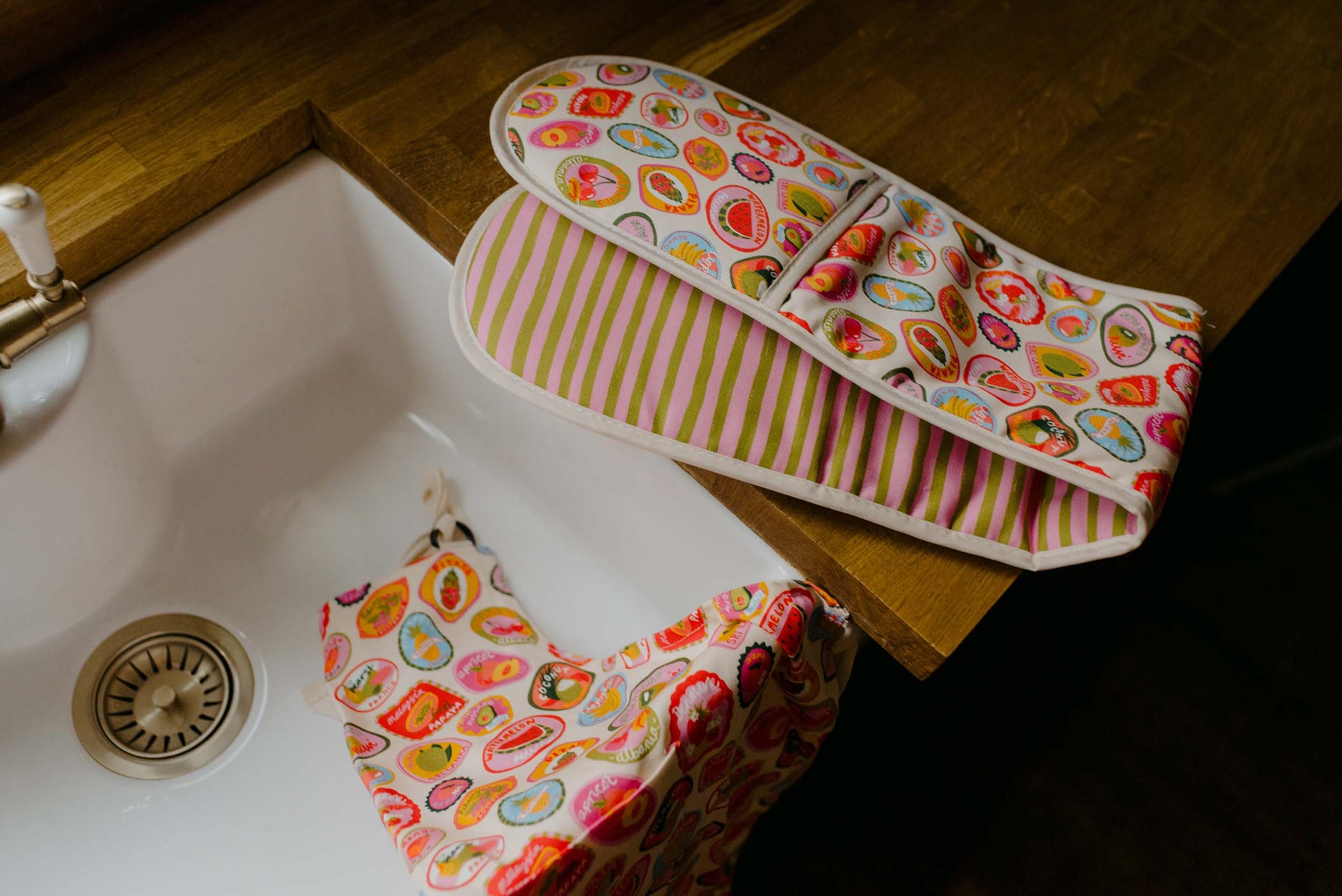 The front features the Fruit Stickers print, while the reverse has a vibrant pink and green stripe pattern. Finished with natural binding and a handy hanging loop. The gloves measure 96cm x 20cm.