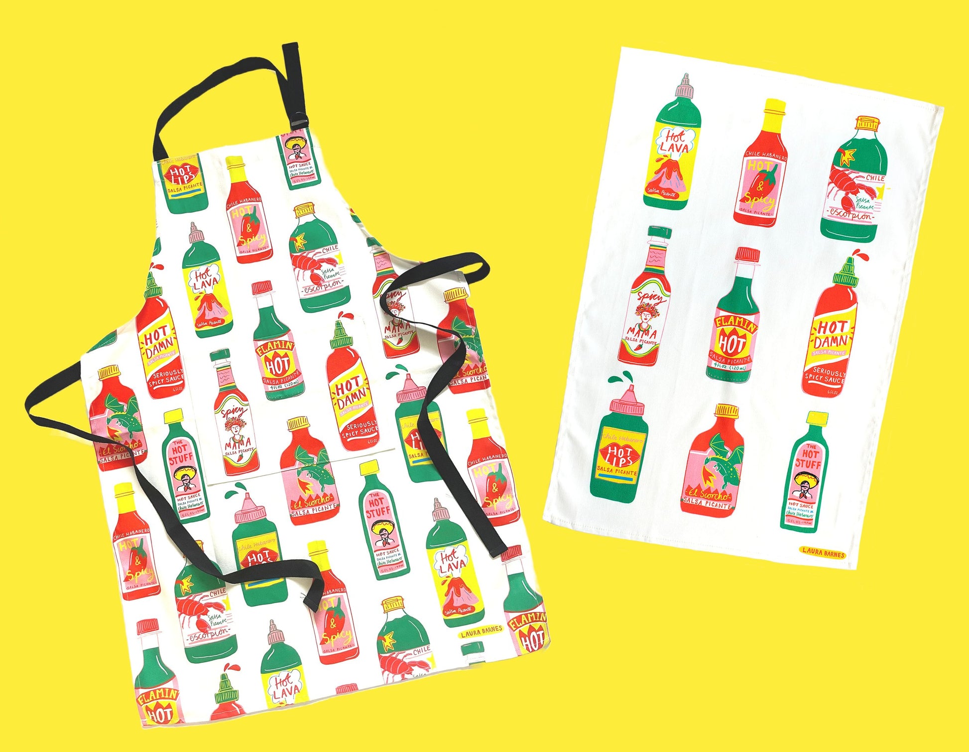 Le motif dessiné à la main présente différentes bouteilles de sauce piquante avec des étiquettes amusantes indiquant des choses comme « hot stuff » et « spicy mama ». Il a été imprimé numériquement sur du coton 100 % biologique de haute qualité à l'aide d'encres réactives, ce qui signifie que l'impression est belle et vibrante et que les couleurs durent lavage après lavage.