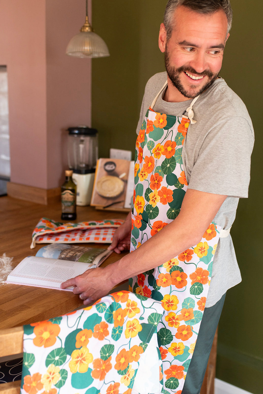 This beautiful apron has a lovely colourful print Nasturtiums print, hand drawn by Laura and would make the perfect gift for a gardener or fan of these beautiful edible flowers. The hot orange, yellow and red flowers are complimented by a lilac base.