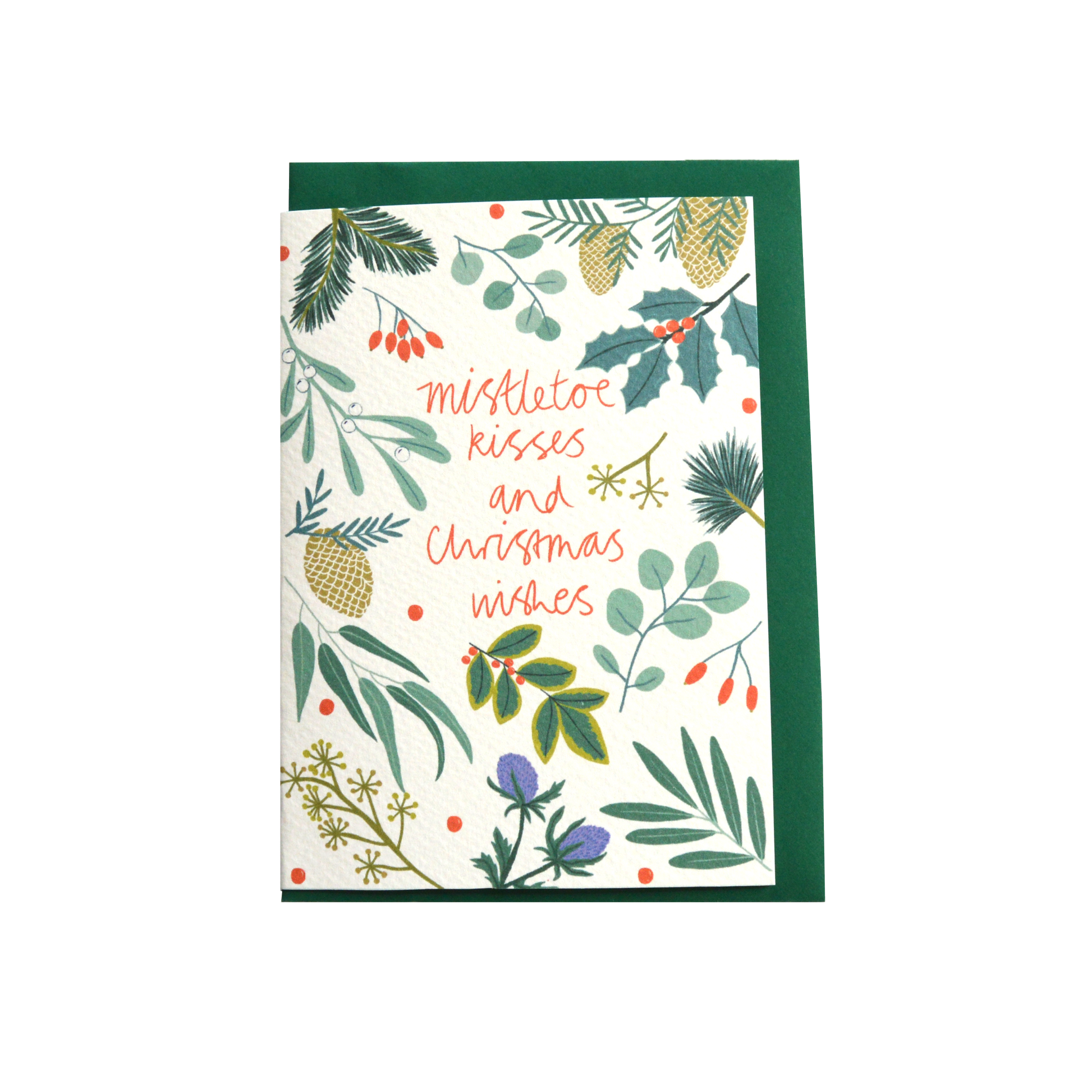 Une belle carte de Noël avec un feuillage festif dessiné à la main sur un fond blanc. Disponible en carte simple ou en lot.