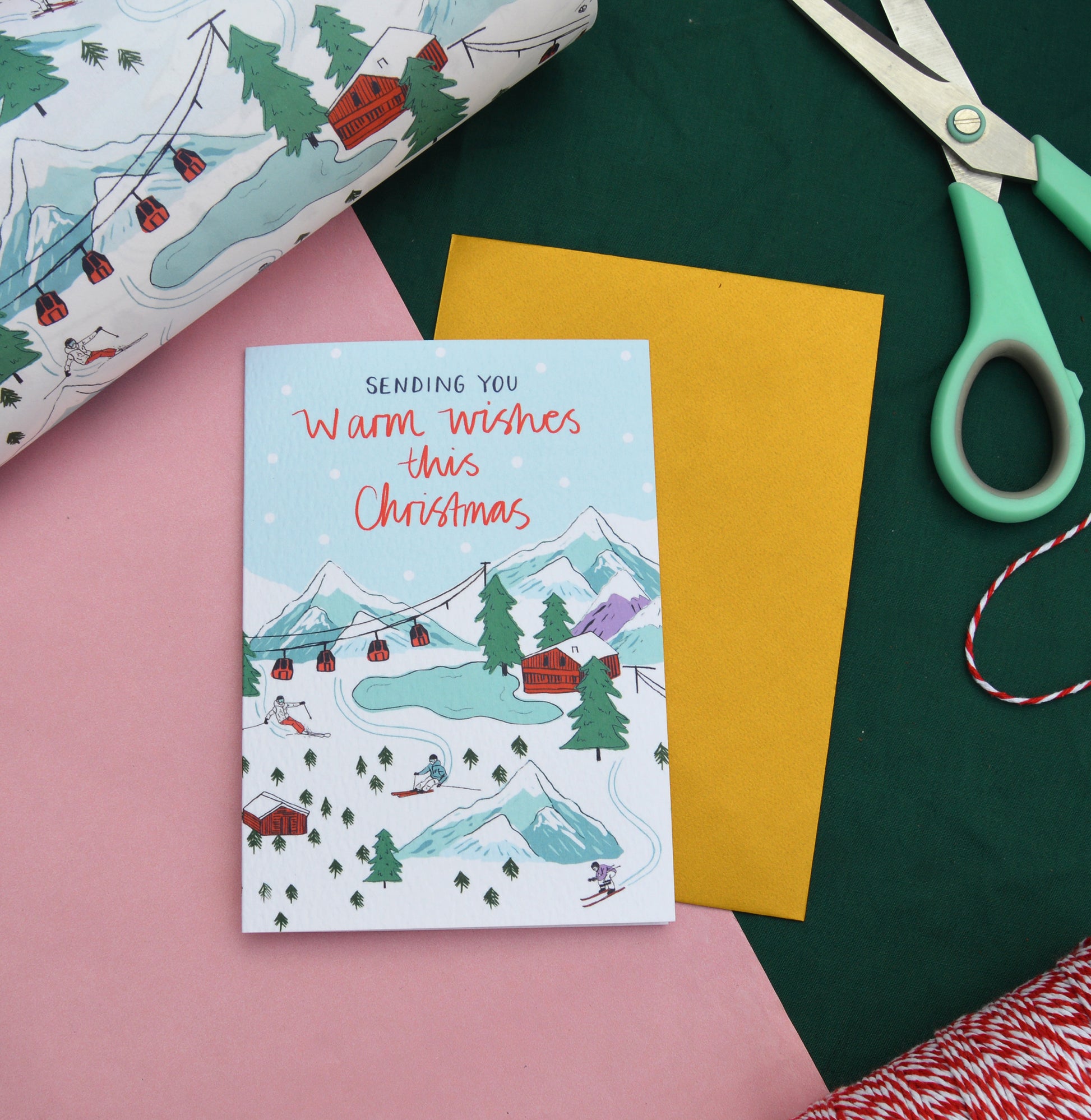 Une carte de Noël portrait présentant une belle scène de ski illustrée et le texte manuscrit « Je vous envoie mes meilleurs vœux pour ce Noël ».