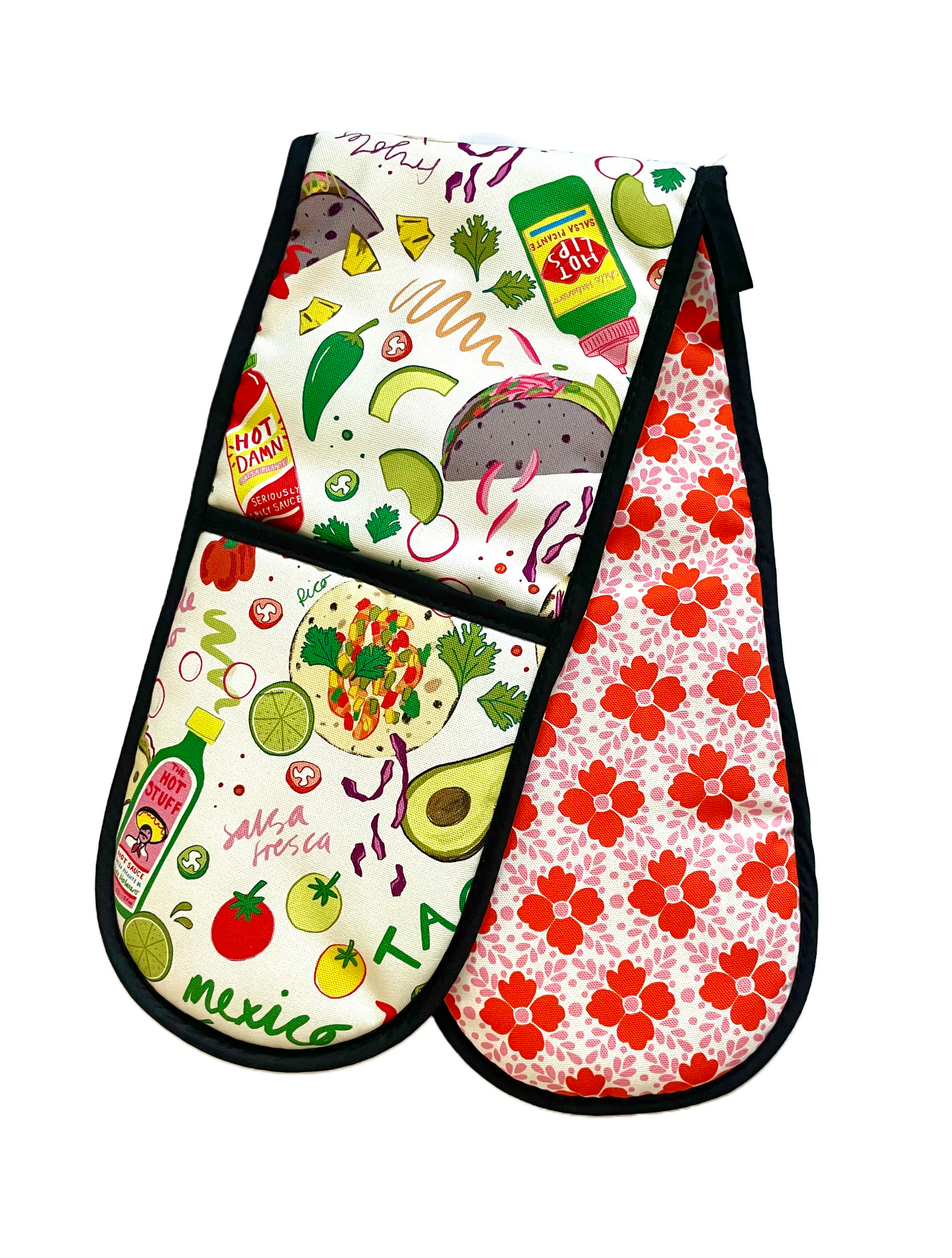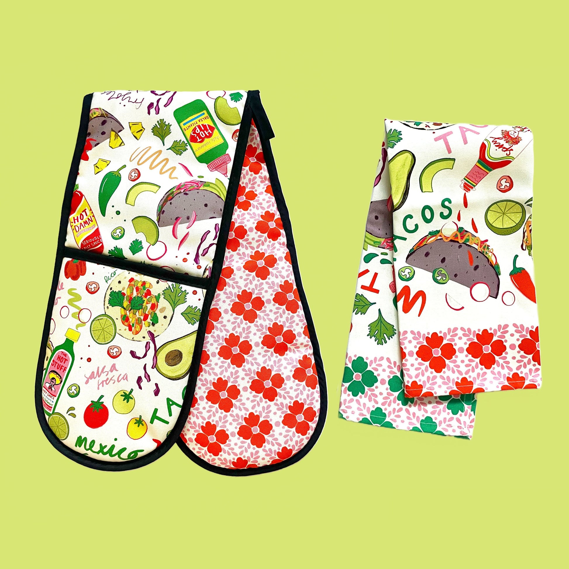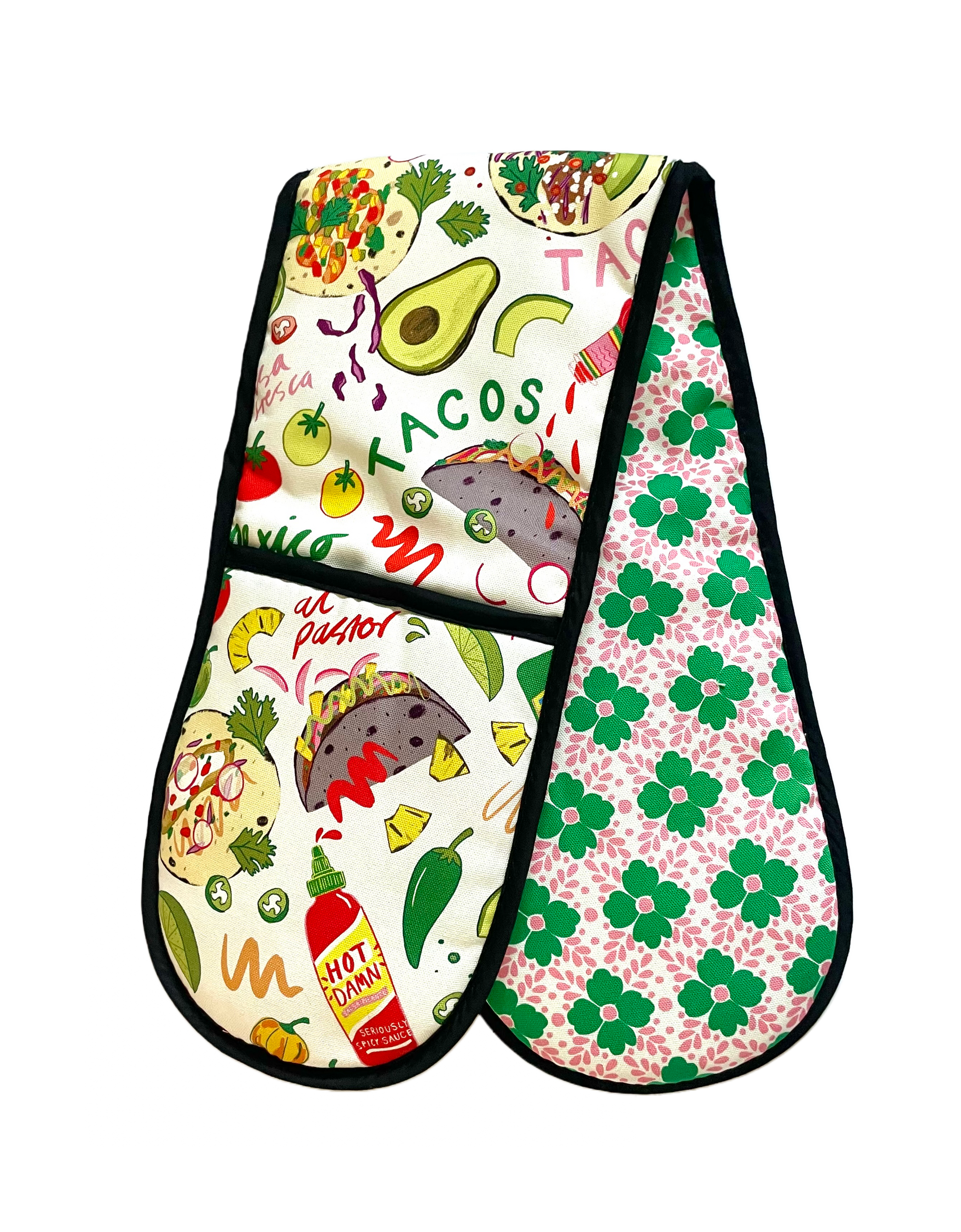 Ces gants de cuisine colorés ont un imprimé amusant sur le thème des tacos et constituent un excellent cadeau pour les gourmets ou les amateurs de voyages.