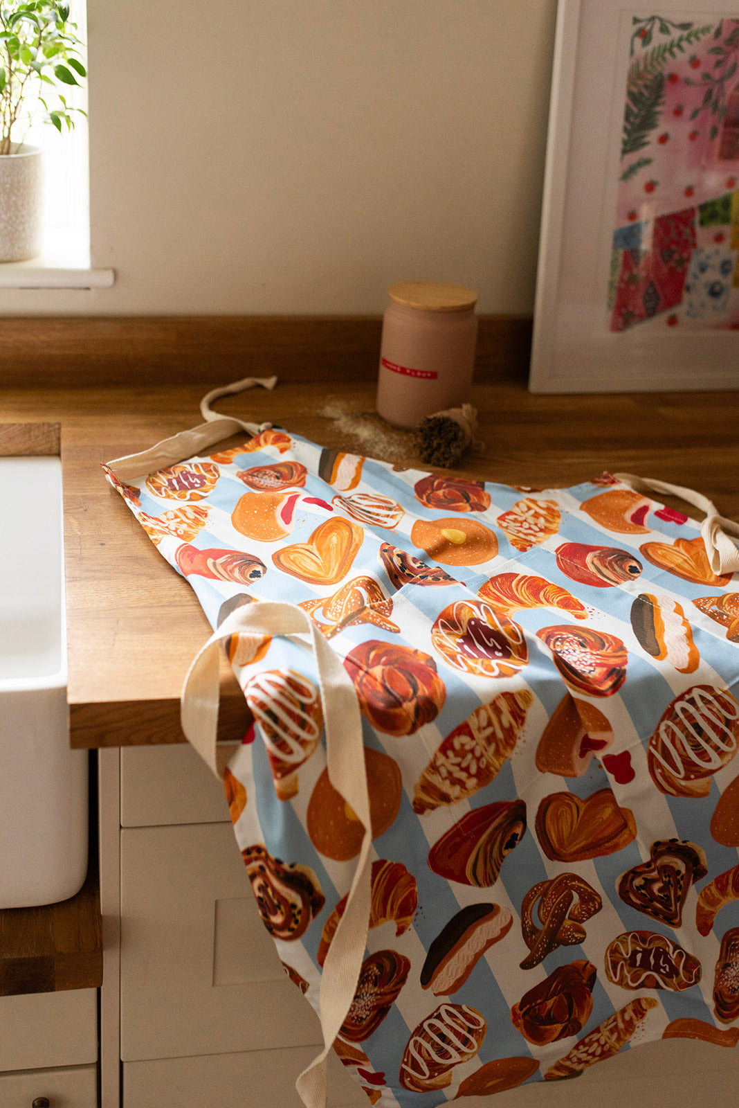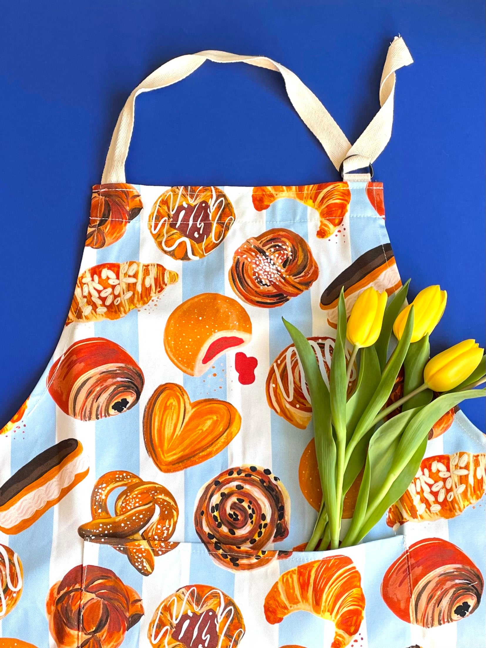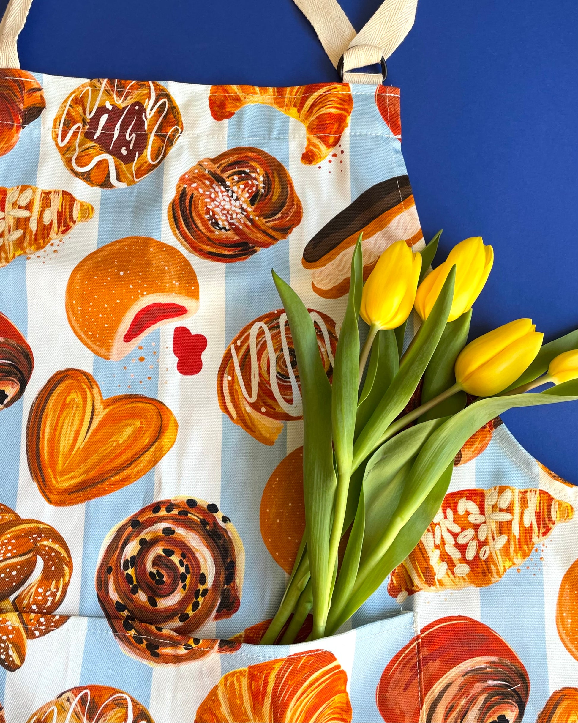 This beautiful illustrated apron is perfect for home bakers and pastry lovers. The print is hand painted by Laura and features classic baked goods from croissants to cinnamon buns on a baby blue stripe, inspired by shop front awnings. It would make the perfect gift for baking enthusiasts or anyone who loves a sweet treat.