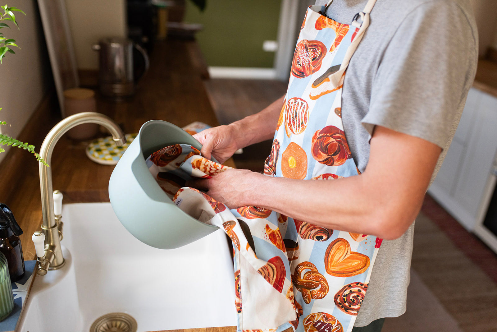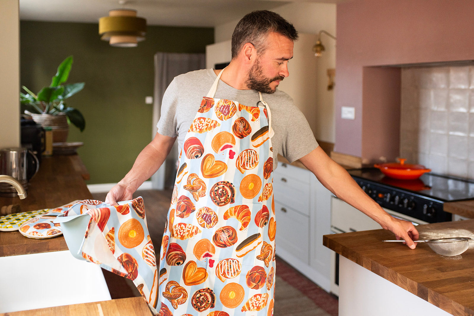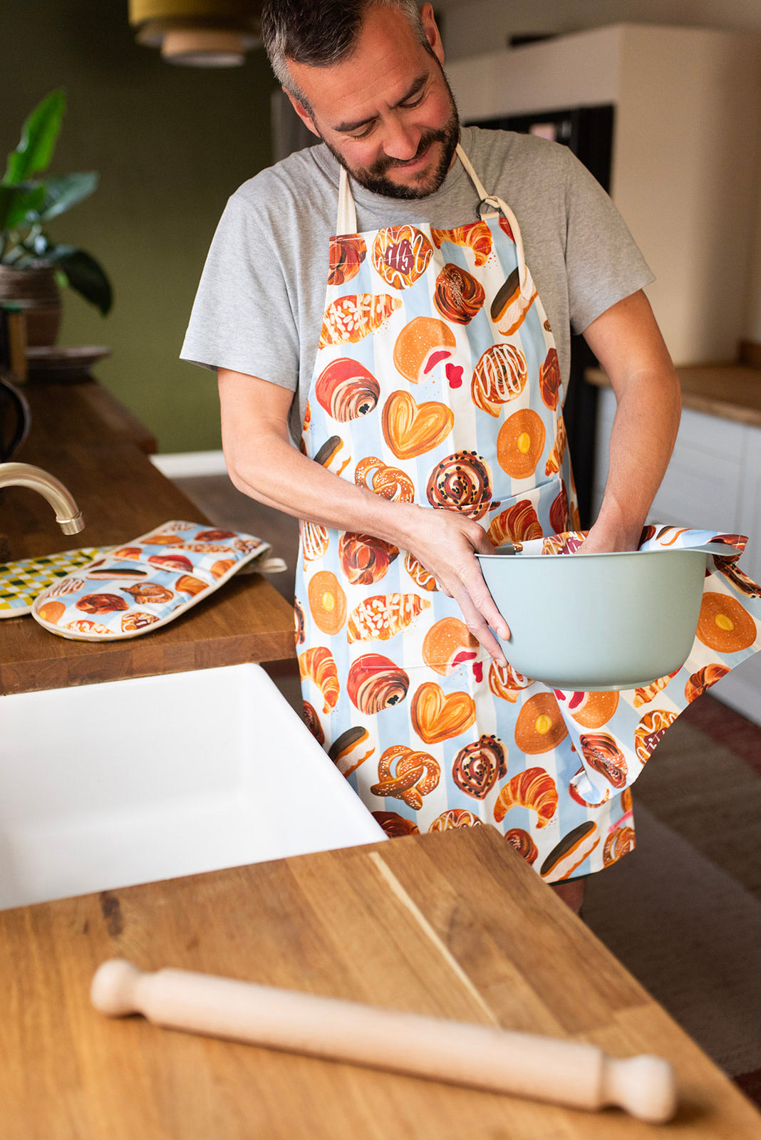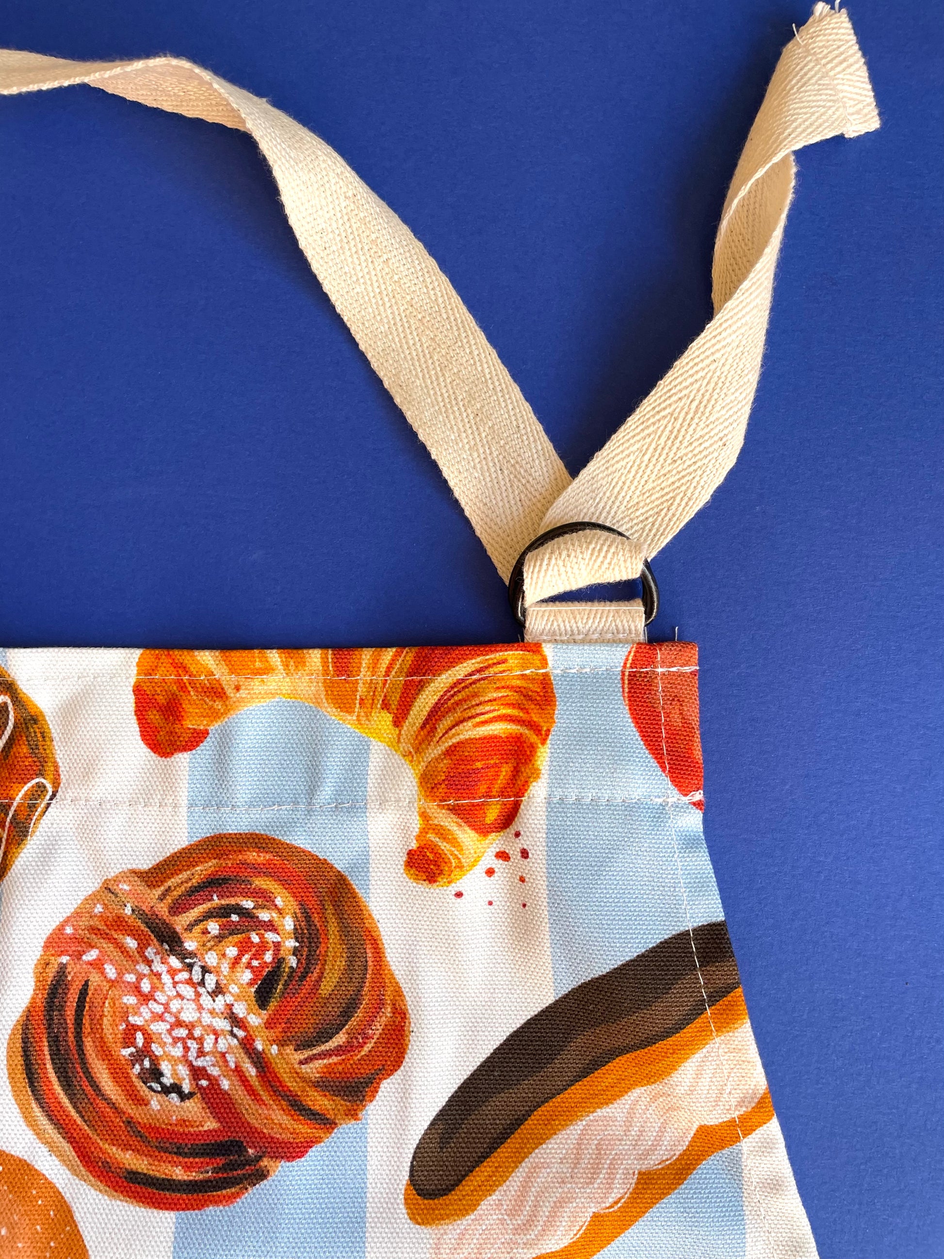 This beautiful illustrated apron is perfect for home bakers and pastry lovers. The print is hand painted by Laura and features classic baked goods from croissants to cinnamon buns on a baby blue stripe, inspired by shop front awnings. It would make the perfect gift for baking enthusiasts or anyone who loves a sweet treat.