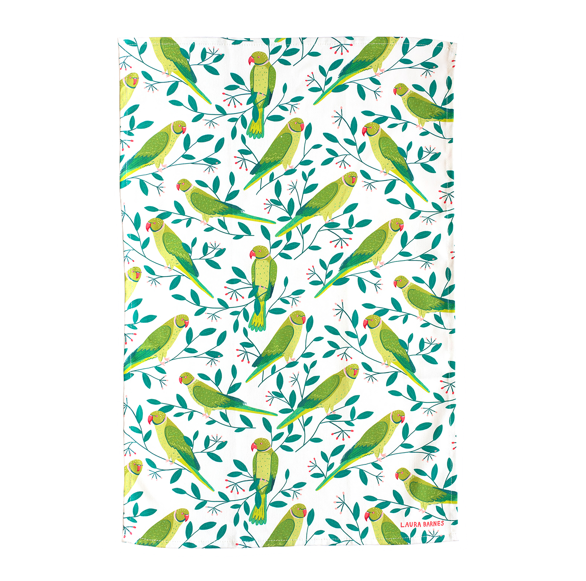 A vibrant green and white botanical tea towel with a beautiful hand drawn parakeet pattern. The exotic green birds that inspired these designs, can often be spotted and heard flying around London. Now they can be spotted in a kitchen near you!