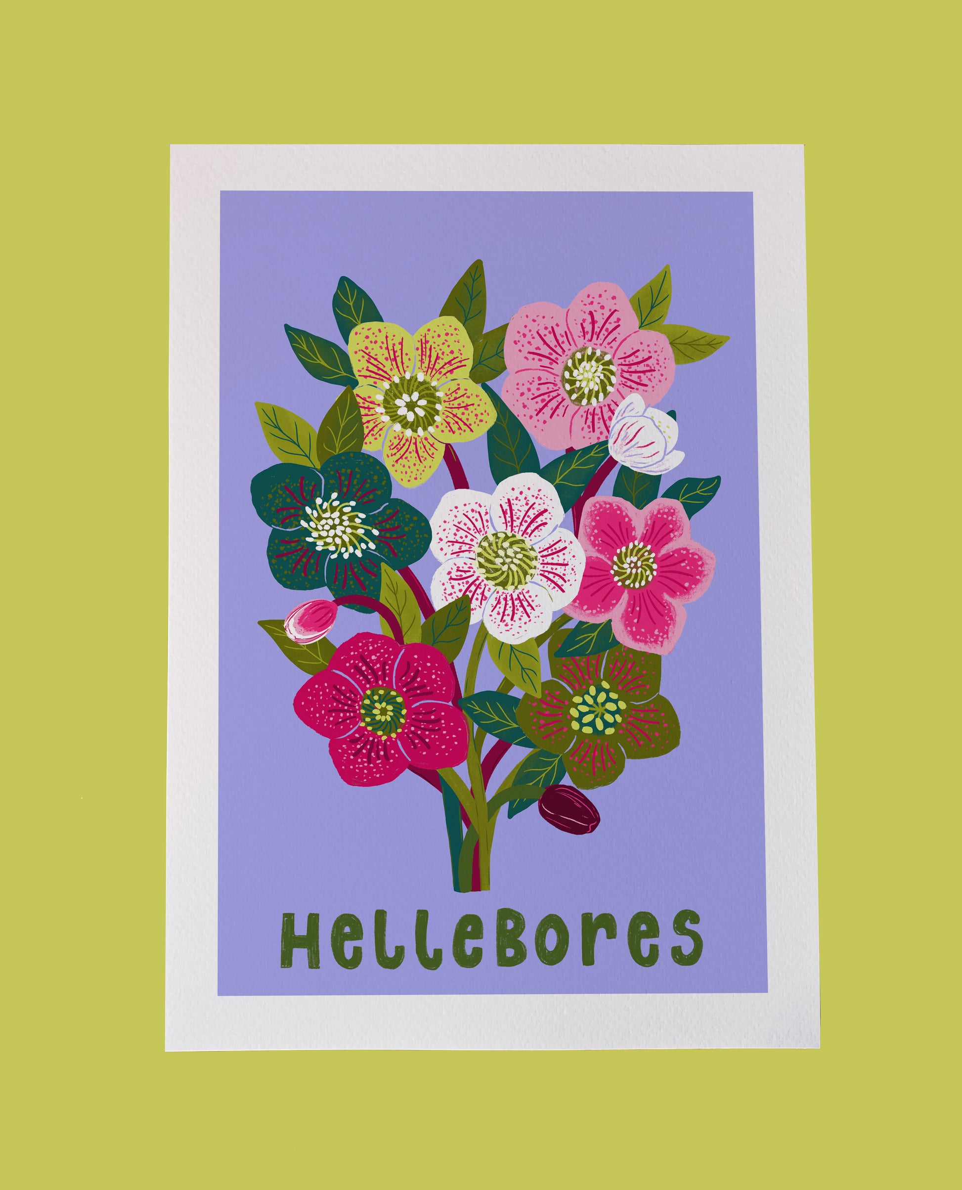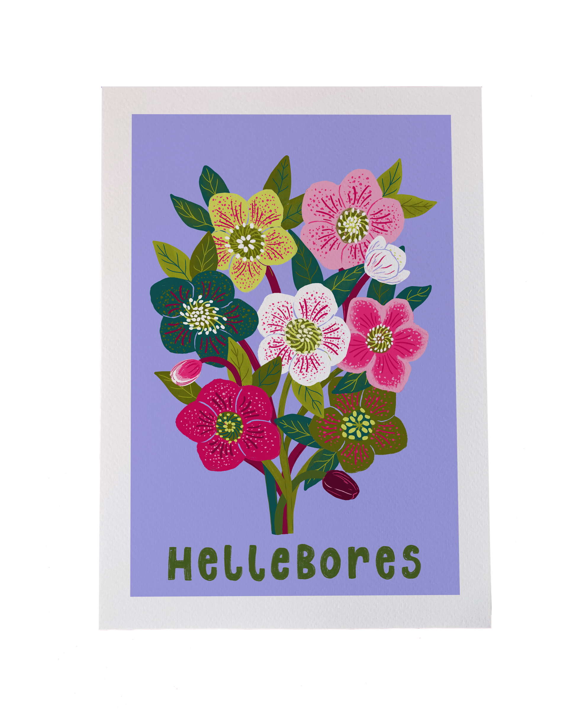 Lovely illustration of a bunch of beautiful Hellebores on a lilac background with hand lettering. This floral print would make a great, long lasting gift alternative to a bunch of flowers. Guaranteed to cheer anyone up and would be a colourful addition to any home. Hellebore represent peace, serenity and tranquility and usually bloom from December to April.