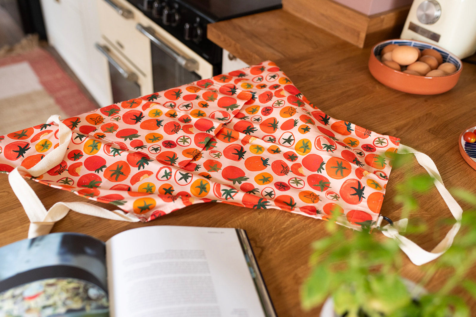 This colourful apron features a fun tomatoes print, hand drawn by Laura. It would make the perfect gift for a fan of Mediterranean style cooking or someone who loved to grow their own produce. The hot orange and red tomato design sits on a light pink base and would add a splash of colour to any kitchen.