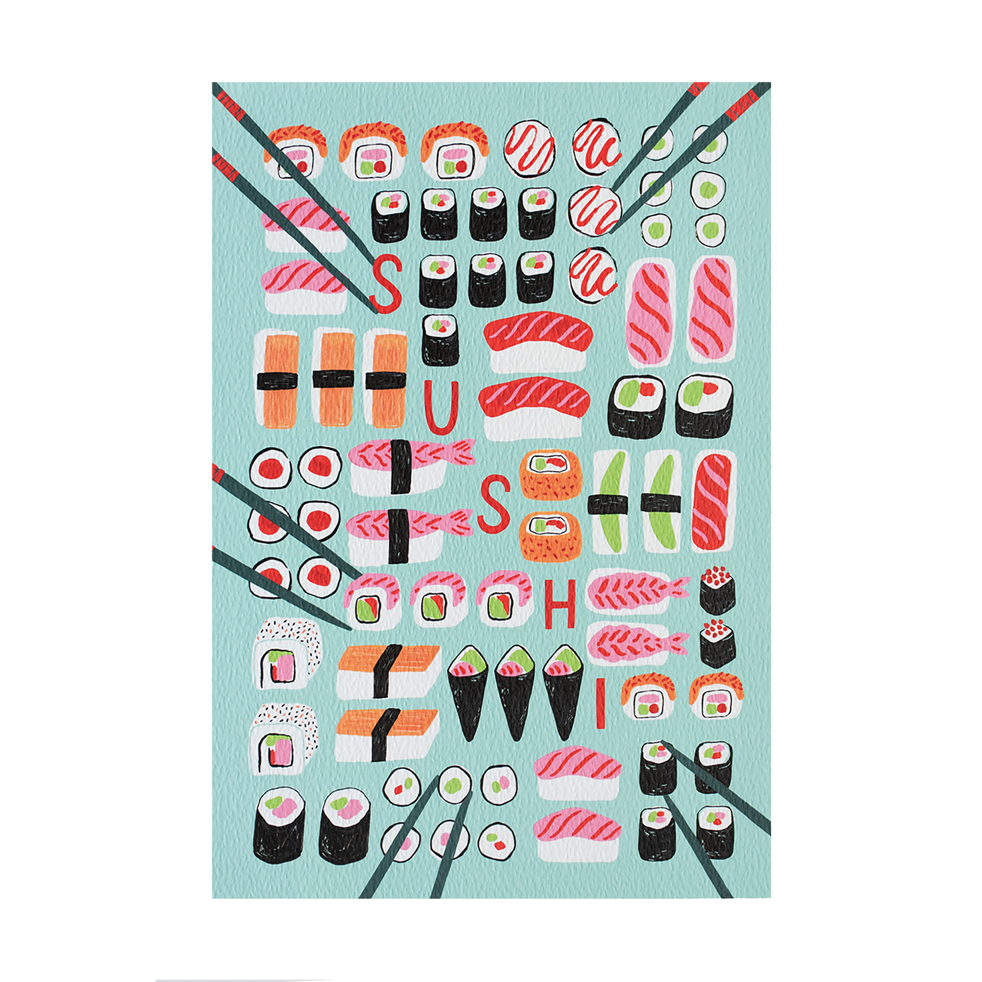 This sushi design started life in Laura's sketchbook and was created using a combination of hand drawing, painting and digital techniques to create an original illustration.